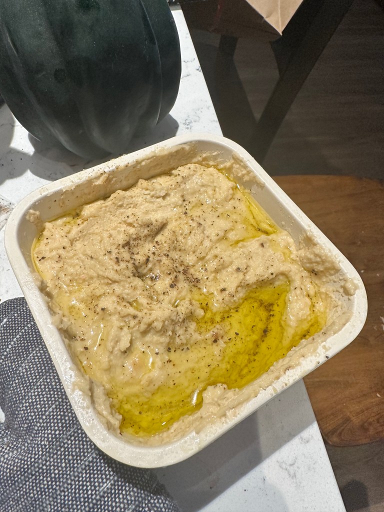 In a food processor, add both cans of beans and 1/4 EVOO, plus salt and pepper. Pulse to blend. Add the roasted garlic to the mixture by squeezing the cloves. Blend again, adjusting the seasoning to your taste. Add additional olive oil if the mixture is too dense. Don’t worry if all of the Garbanzo beans don’t smash entirely, this will give the dip a little more of a rustic look to it. Place in a container and drizzle with additional EVOO plus pepper and just a hint of salts. Serve with pita chips, fresh bread, or whatever cracker you like. You can even use this as a topping for sandwiches.