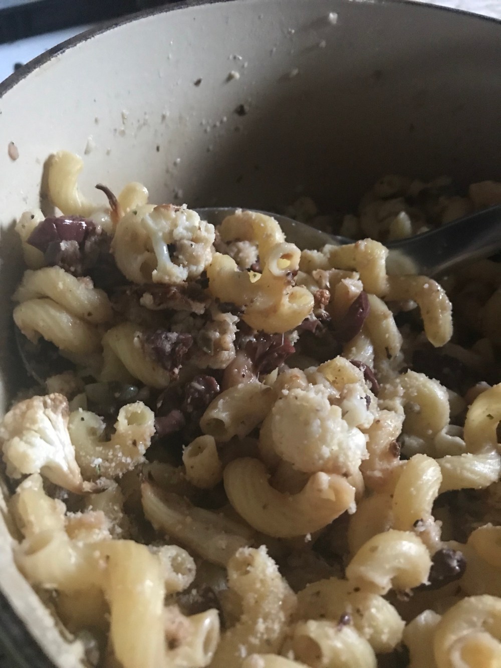In a large Dutch oven, heat olive oil and add garlic, stirring until garlic starts to turn golden. Add the chili flakes and chopped olives, stirring to combine. Next add the cauliflower and capers, just until combined.